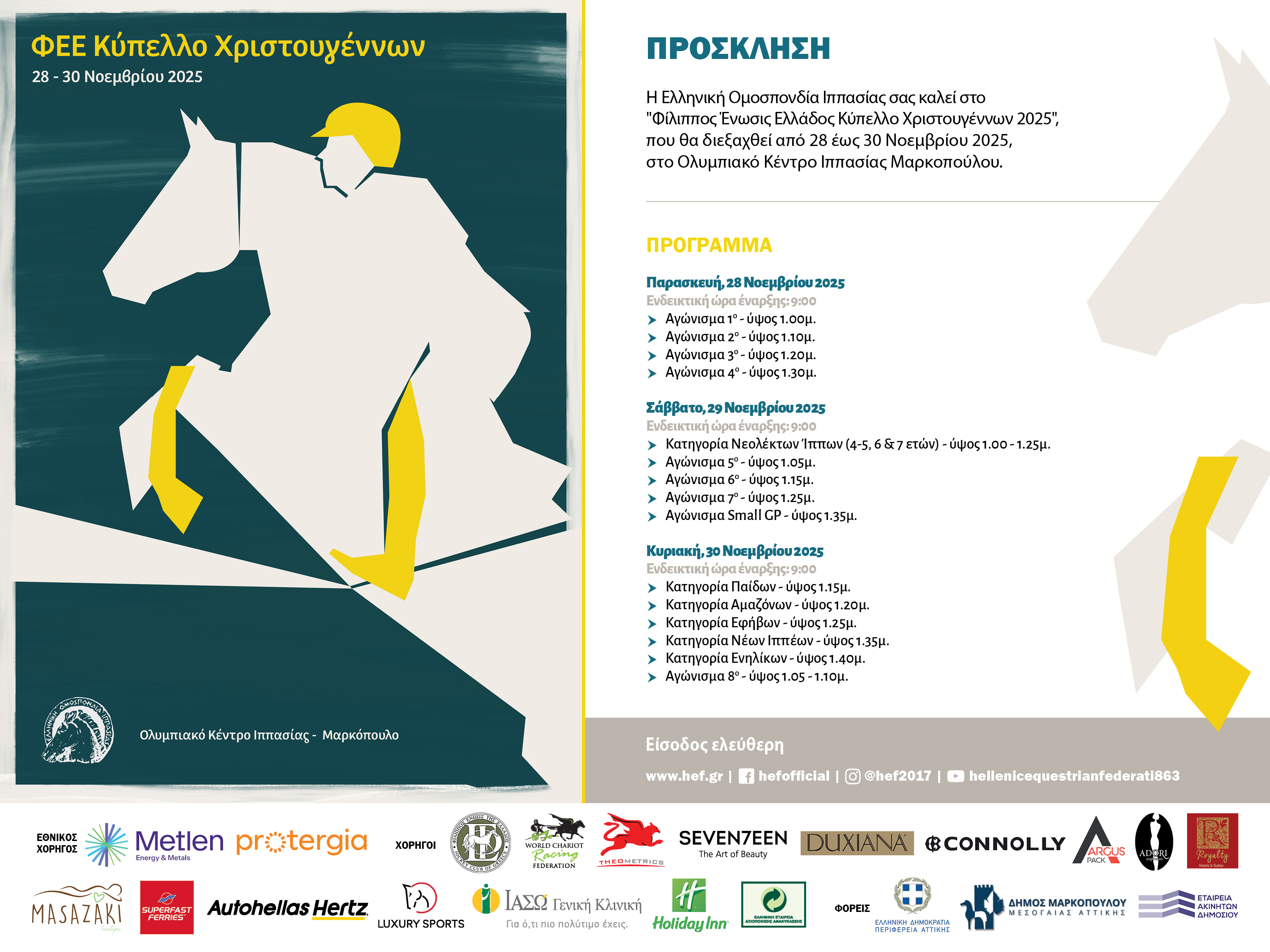 Πρόκειται για τους τρεις τελευταίους αγώνες της χρονιάς σε υπερπήδηση εμποδίων και ιππική δεξιοτεχνία. Αυτή την εβδομάδα, από 28 έως και 30 Νοεμβρίου 2025, θα πραγματοποιηθεί το «Φίλιππος Ένωσις Ελλάδος» Κύπελλο Χριστουγέννων στην υπερπήδηση εμποδίων.